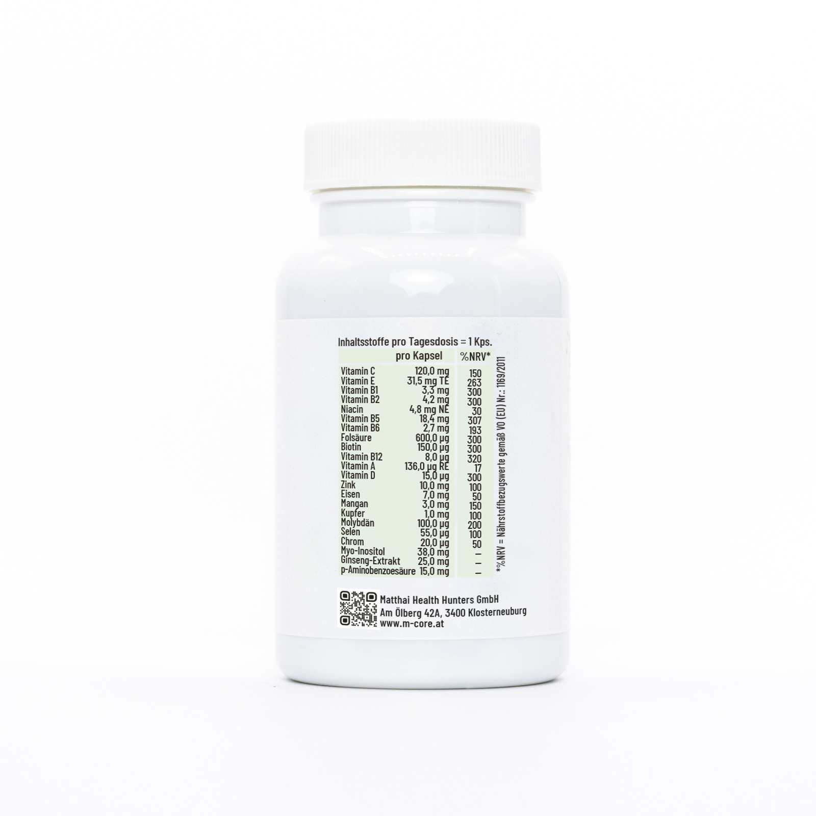 Calciumascorbat-Dihydrat, D-alpha-Tocopherolacetat, Eisen-II-Gloconat, Myo-Inositol, Zinkcitrat-Trihydrat, Magnesiumcarbonat, Ginseng-Extrakt, Calcium-D-Pantothenat, p-Aminobenzoesäure, Mangan-II-Sulfat, Selenmethionin, Natriummolybdat, Cholecalciferol, Niacinamid, Pyridoxalphosphat, Riboflavin, Thiaminmononitrat, Kupfercitrat, Chrom-III-Chlorid, Retinyl-acetat, Pteroylmonoglutaminsäure, D-Biotin, Methylcobalamin, modifizierte Cellulose (Kapselhülle)